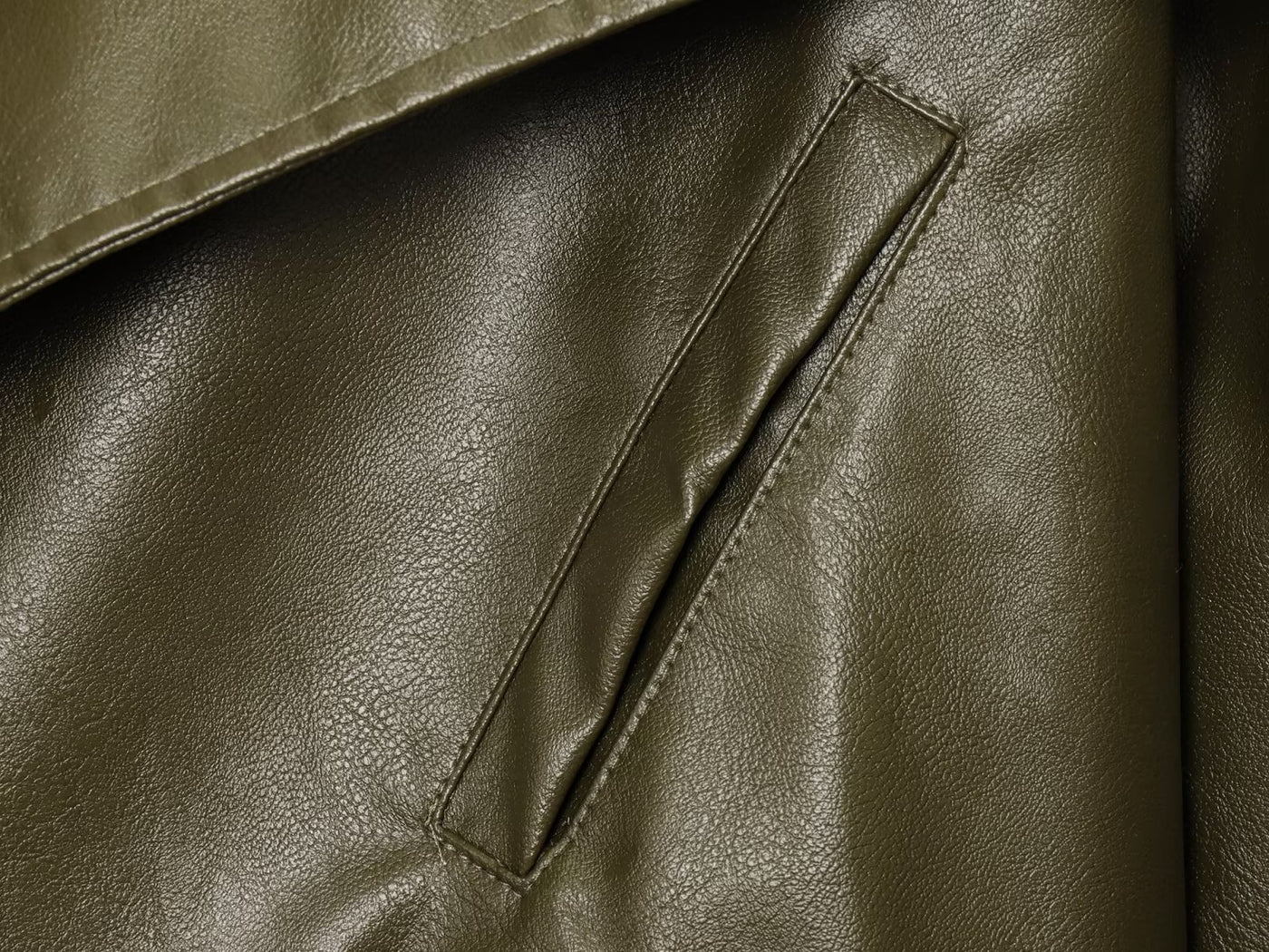 Das markante Oversized-Revers, dekorative Schulterriegel und verstellbare Gürtel-Details an Ärmeln und Saum verleihen AMIRA eine ausdrucksstarke Silhouette mit High-Fashion-Appeal. Das leicht glänzende, grüne Finish sorgt für einen edlen Look mit urbanem Edge – ein Essential für alle, die auffallen wollen, ohne laut zu sein.