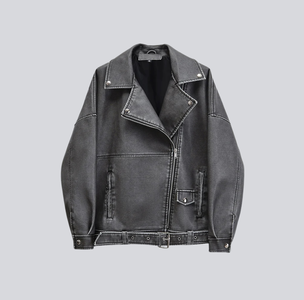 LIORA – Vintage-Kunstlederjacke mit Gürtel in Grau